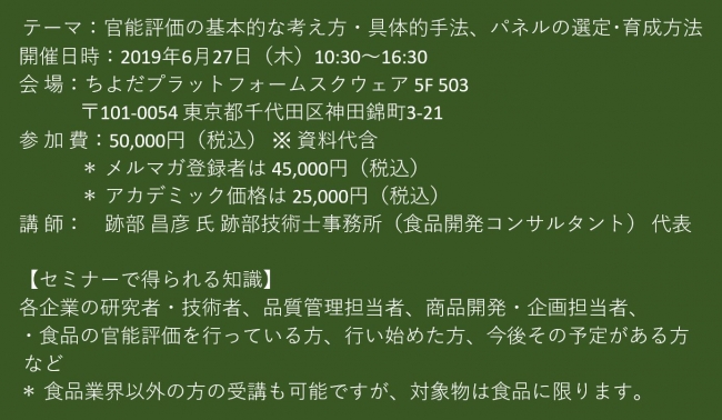 先端技術情報や市場情報を提供している(株)シーエムシー・リサーチ(千代田区神田錦町: http://cmcre.com/ )では、 各種材料・化学品などの市場動向・技術動向のセミナーや書籍発行を行っておりますが、 このたび「官能評価の基本的な考え方・具体的手法、パネルの選定・育成方法」と題するセミナーを、 講師に跡部 昌彦 氏(跡部技術士事務所(食品開発コンサルタント) 代表)をお迎えし、2019年6月27日(木)10:30より、 『ちよだプラットフォームスクエア』5階503会議室(千代田区錦町)で開催いたします。 受講料は、 一般:50,000円(税込)、 弊社メルマガ会員:45,000円(税込)、 アカデミック価格は25,000円となっております(受講料には資料代を含みます)。