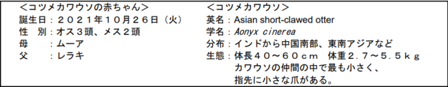『横浜・八景島シーパラダイス』の水族館「アクアミュージアム」4階にある水辺と海にくらす生きものを展示するエリア「フォレストリウム」では、2021年10月26日(火)、「コツメカワウソ」の赤ちゃんが5頭誕生いたしました。
