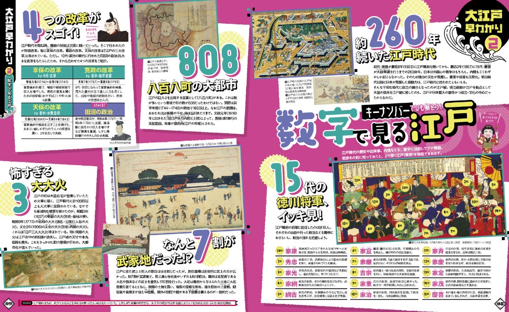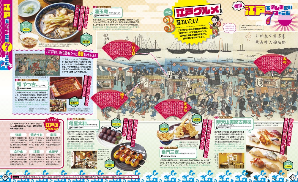 巻頭特集では、浮世絵や錦絵、写真を使った「るるぶ」ならではのビジュアル展開で、江戸時代の特徴や文化を解説しています。また江戸グルメやグッズの掲載もあり、見て、読んで、楽しめる内容です。加えて江戸時代の町人・武士の暮らしをのぞき見できるモデルコースも提案しています。