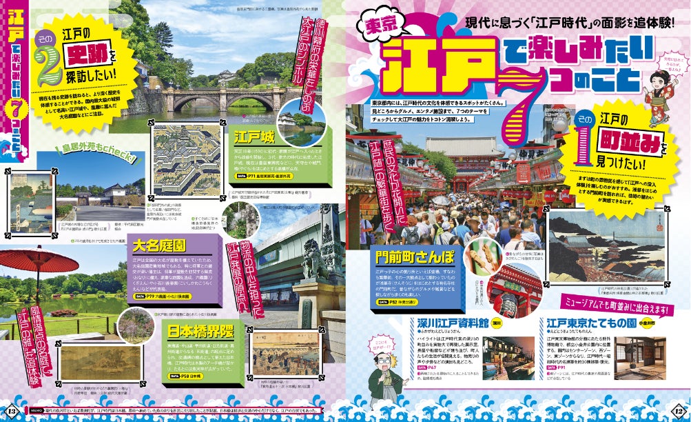 旅行ガイドブック「るるぶ」が、時を超えて江戸(現在の東京都下)&江戸時代の旅を案内します。前半部は、江戸時代のカルチャーガイドとして「元禄文化」「化政文化」を紹介。浮世絵・菱川師宣、風景画・葛飾北斎、美人画・喜多川歌麿、名所絵・歌川広重など、作品と人物を合わせて解説します。後半部は、江戸の面影を残す「浅草」「上野」「日本橋」「両国」などの町歩きを楽しめるエリアガイドです。また、巻頭インタビューでは、2025年5月に八代目尾上菊五郎を襲名する【歌舞伎俳優 五代目尾上菊之助さん】が江戸や江戸時代に対する思い、歌舞伎を通して感じる江戸の印象などを語ります。