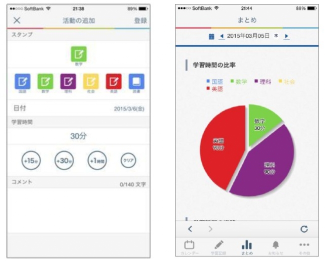 毎日の学習時間や学習内容を生徒自身が記録できる機能です。スマートフォン用のアプリもありますので、い