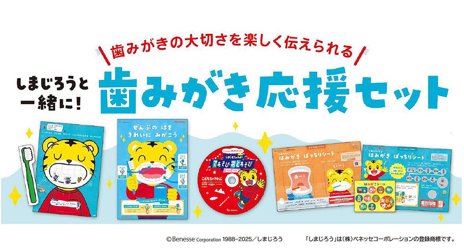 全国の保育園・幼稚園約1.5万園を対象に、園生活の中での歯みがき指導に活用できる「しまじろうと一緒に!歯みがき応援セット」をベネッセ「こどもちゃれんじ」が配布します。園向けには、しまじろうと一緒に紙ハブラシつきで歯みがきを実演できるしかけ絵本やポスター・CDを、家庭向けには、子どもが楽しみながら歯みがきができる「おうちで!はみがき ばっちりシート」を提供し、子どもたちが楽しみながら正しい歯みがき習慣を身につけられるようサポートします。