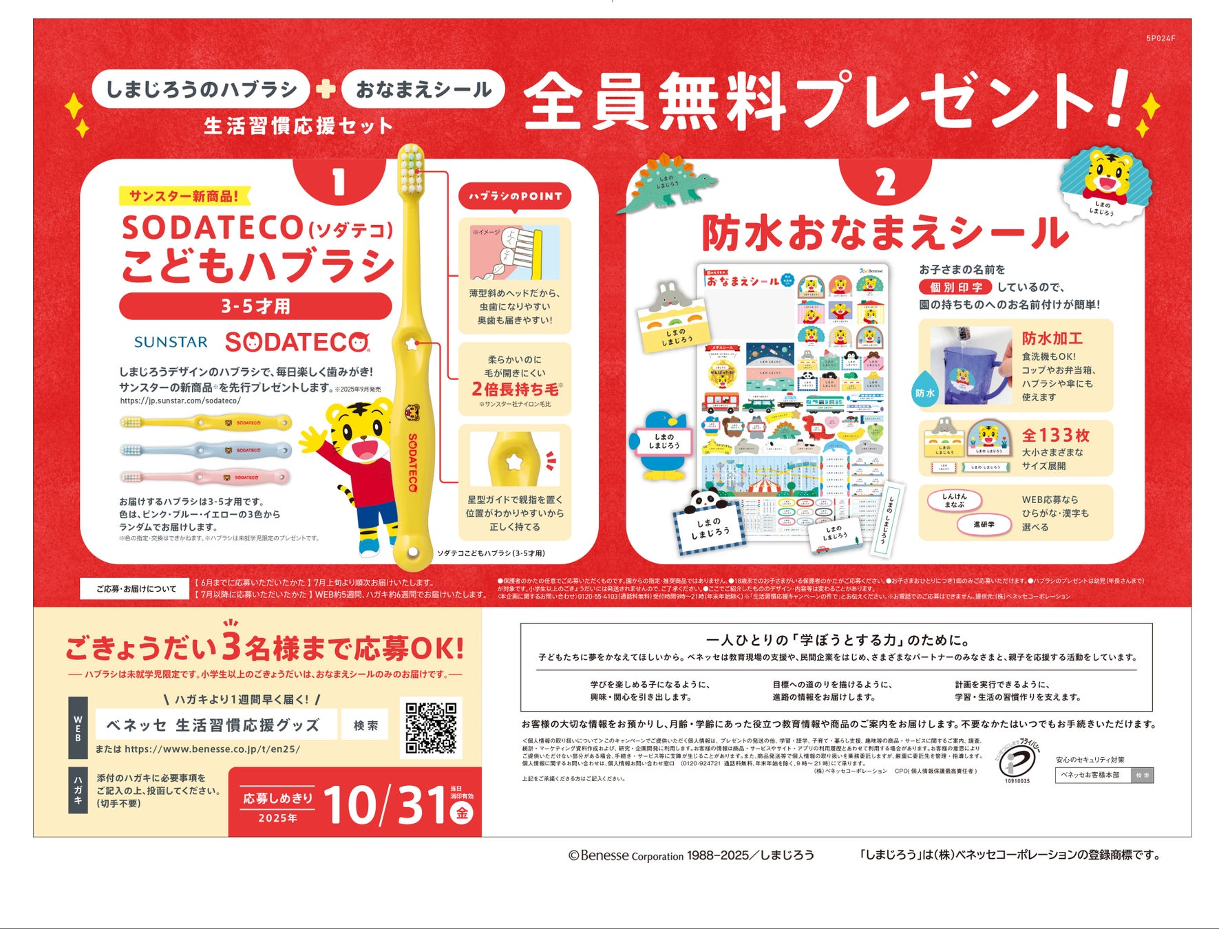 サンスターグループ(以下、サンスター)の子どもの将来のからだの土台作りを「おくち」と「おなか」を通じてサポートするブランド「SODATECO(ソダテコ)」は、ベネッセコーポレーション(以下、ベネッセ)の幼児の教育・生活支援ブランド「こどもちゃれんじ」が全国の保育園・幼稚園約1.5万園に展開する「しまじろうの歯みがきプロジェクト」に参画します。正しい歯みがき習慣のための指導をサポートする「しまじろうと一緒に!歯みがき応援セット」 を2025年5月より配布するほか、応募者全員に対し、「ソダテコこどもハブラシ(3-5才用)」を無償配布します。本プロジェクトを通して、子どもたちが楽しく正しい歯みがき習慣を身につけ、生涯にわたって健康な口腔環境を維持できるようサポートします。
