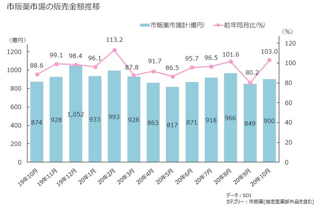 - 10月度の販売金額は900億円、消費税増税後の買い控えの影響があった昨年10月との比較で103.0%。半数以上の薬効でプラスだった「市販薬市場の販売金額推移」