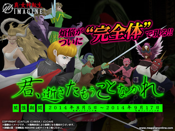 株式会社ケイブ(本社:東京都目黒区、JASDAQコード:3760)は、オンラインRPG『真・女神転生IMAGINE』において、本日8月5日(火)より、夏季イベント「君、逝きたもうことなかれ」を開始いたしました。そのほか、同時開催となる大型キャンペーンの紹介がございますので、あわせてお伝えいたします。