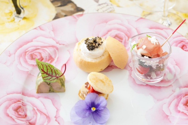 【三大珍味セイボリー】生ハムにペッパードロップとオリーブのマリネ/キャビアとサワークリームのブレッドカップ/トマトのピクルスにトリュフのアクセント/フォアグラテリーヌ