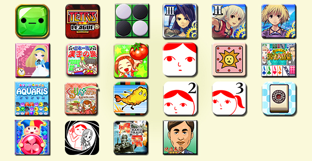 ふみふみ少女マシタちゃん/ TETRIS® LEAGUE / あつまれ天才オセロ / フライハイトクラウディア3 / フライハイトクラウディア2 / フライハイトクラウディア / アリスのソリティア / 日本一周漢字の旅 / ワンダーファームリゾート ぼくと妖精のしま / 空気読み。 / どうぶつしょうぎ / あつまれ天才大富豪 / アクアリス / くるりんcafe / 天ぷらの乱 / 空気読み。2 / 女子の空気読み。 / あつまれ天才麻雀 / マジカルドロップ / 占いバキューン!空気読み。編 / 爆雷 / 焼肉奉行 豪華版