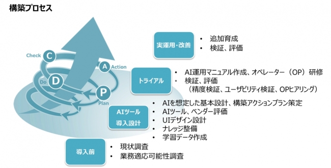 AI導入の各フェーズに発生する課題・疑問点などの導入ハードルを網羅し、導入前~運用までをトータルに支援します。特にAI導入において最も重要な学習データの作成については、シナリオやトークスクリプトなどの構築経験で培われたトランスコスモス独自のナレッジを活用し、AIストラテジストが支援します。