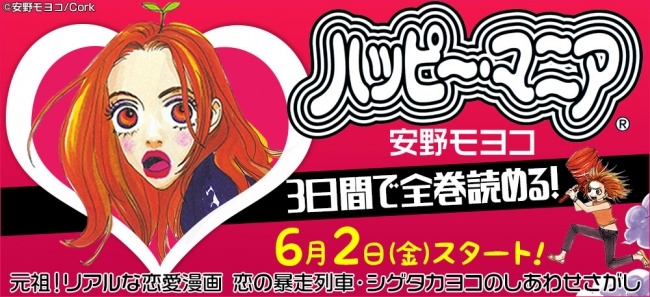 また、『三国志』や『魁!!男塾』、『賭博黙示録カイジ』など、多くのまんがファンにご好評をいただいて全巻無料読み放題企画を6月は毎週末、計4回実施する予定です。第一弾として6月2日(金)~6月4日(日)の3日間で安野モヨコ『ハッピー・マニア』全11巻が無料で読み放題になる企画を実施いたします。
