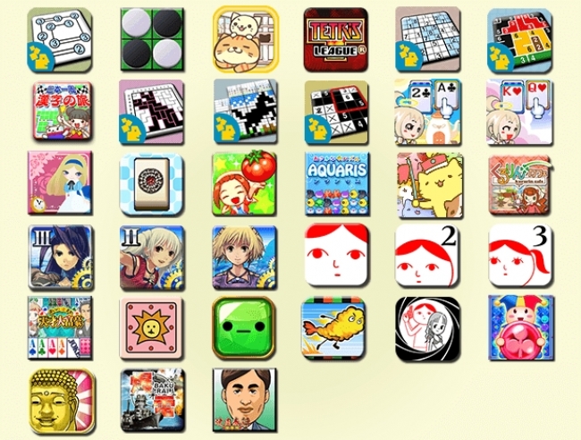 ブリッジパズル / あつまれ天才オセロ / ねこのけ / TETRIS® LEAGUE / ナンプレ / リンク絵 / 日本一周漢字の旅 / クロスぬり / アートロジック / モザイクアート / 天使のソリティア クロンダイク / 天使のソリティア スパイダー / アリスのソリティア / あつまれ天才麻雀 / ワンダーファームリゾート ぼくと妖精のしま / アクアリス / みっちりねこ だっしゅ! / くるりんカフェ / フライハイトクラウディア3 / フライハイトクラウディア2 / フライハイトクラウディア / 空気読み。 / 空気読み。2 / 空気読み。3 / あつまれ天才大富豪 / どうぶつしょうぎ / ふみふみ少女マシタちゃん / 天ぷらノ乱 / 占いバキューン!空気読み。編 / マジカルドロップ / 出家なう。~金色のおっさんと仏の秘め事~ / 爆雷 / 焼肉奉行 豪華版