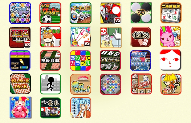 Crystal Drop / 公園サッカー / アーチェリー / 対戦!あつまれ天才花札 / 対戦!あつまれ天才オセロ / 二角麻雀牌 / TETRIS® LEAGUE / わくわくハチ散歩 / 対戦!あつまれ天才大富豪 / オネコマンマのマインスイーパー / 七並べ / どうぶつナンプレ ズープレ / BLOCK&CRASH / 神経衰弱 / あわせてカラフル / SPEED / SMART AIR HOCKEY / 空気読み。 / BLACK JACK / じゃんかべ / 寿司とりっ! / ペグソリティア / 若様大脱走 / ネコQ / マジカルドロップ / こいこい花札 / Icy cave