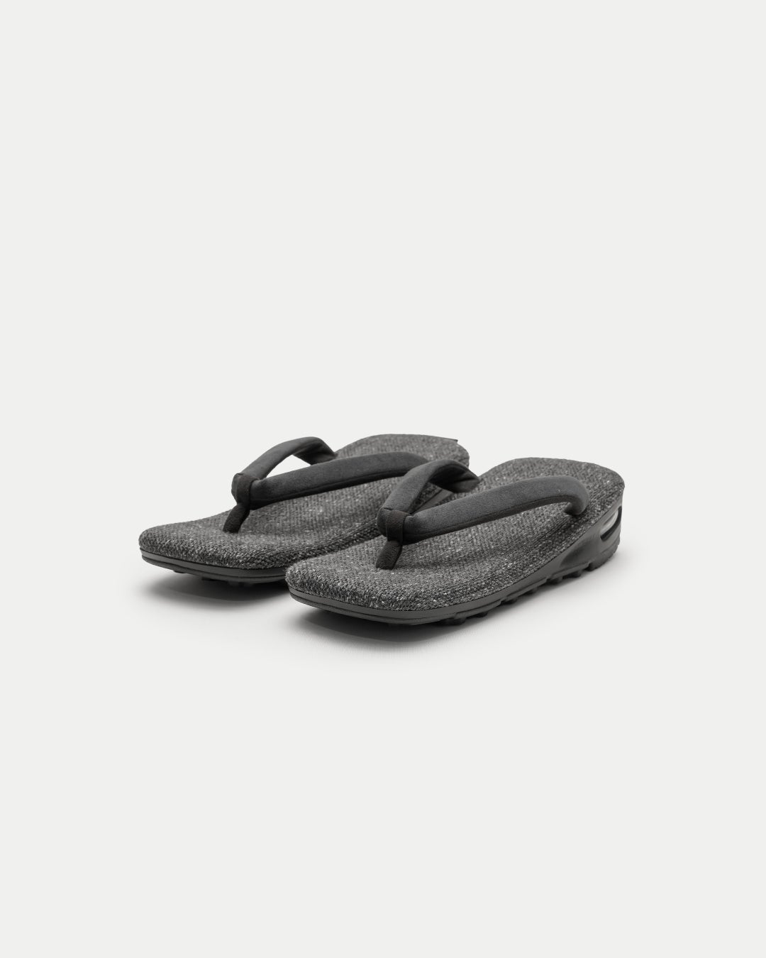 ムラのある風合いによる奥行きのある印象に加え、コットンのやわらかい履き心地と化繊のタフさを兼ね備え、日常使いにも十分な耐久性を実現しています。さらに内部には高反発ウレタンフォームを搭載し、まるで雲の上を歩いているかのような履き心地に。鼻緒にはチャコールのウルトラスエード®を配し、全体をチャコールのダークトーンで統一した一足に仕上げました。