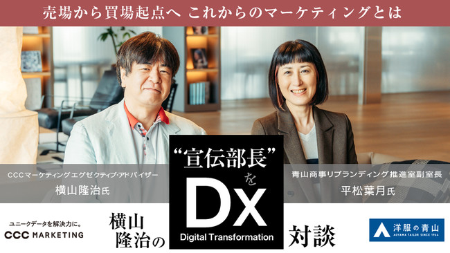 「ユニークデータ※1を解決力に。」をキーメッセージに掲げ、年間トランザクション50億件超におよぶ購買データや7,000万人を超える生活者の多種多様なライフスタイルデータをもとに、さまざまな企業の課題解決に取り組むCCCマーケティング株式会社(本社:東京都渋谷区、代表取締役社長:北村和彦)は、このたび、「エグゼクティブ・アドバイザー」の横山隆治氏と、企業のみなさまのDX(デジタル・トランスフォーメーション)に寄与し、マーケティング課題解決から経営戦略の策定までご支援するべく、「横山隆治の“宣伝部長”をDX」と題した対談イベントを実施しています。このたび、第2回「横山隆治の“宣伝部長”をDX」を2021年9月16日(木)に開催し、青山商事株式会社 リブランディング推進室 副室長の平松葉月氏をお迎えした対談イベントを実施いたしました。