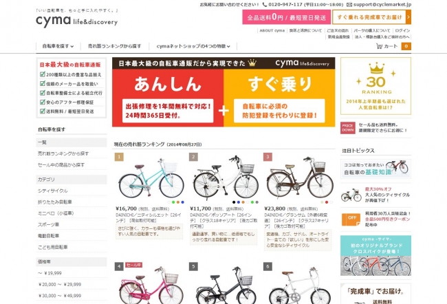 2013年12月サイトオープン。「いい自転車を、もっと手に入れやすく。」をモットーに、300種類以上の自転車を取り揃える自転車専門の通販サイト。お届けする自転車はプロの整備士が一台ずつ組み立て整備を実施。一般の自転車専門店と同じ品質の自転車がネットで購入できます。
