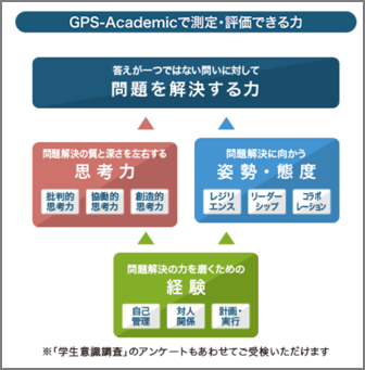 ベネッセi-キャリアは「GPS-Academic(問題解決力を測定する学生向け検査)」「大学生基礎力レポート(学生意識調査)」「GTEC®(英語の4技能を測定する検定/Academicタイプ)」(※1)等、学修成果を可視化するアセスメントを提供しており、全国約360大学、年間約26万人の学生が受検しています。教職員の方には「学生の実態を客観的に把握し、学内の取り組みのPDCAを回すための材料」として、学生には「今すべきことを認識し、自らの成長に向けた行動を起こすきっかけ」として、ご活用いただいています。
