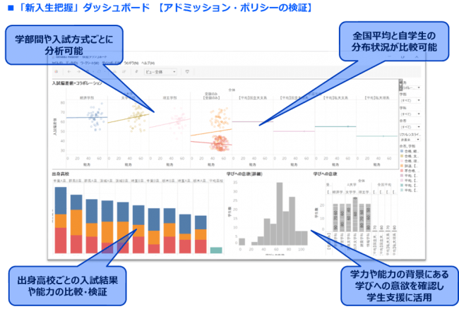 毎年の入試データとアセスメントデータの組み合わせにより、各大学がアドミッション・ポリシーとして求めた学生を獲得出来ているかどうかを、学部や出身校などの観点から多角的に検証できます。これにより、入学の選抜基準や、入学後の具体的な学生支援を検討可能です。