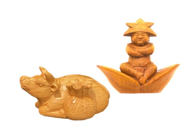 樹齢300年から500年を経た貴重なイチイの木を利用し、大小さまざまなノミを駆使して彫り上げた木工品。加飾、着色をせず、彫刻の技のみで鋭く彫り上げて作品を表現していきます。木目が美しく、時を経るにしたがって艶のある茶褐色に変化していくのが特徴です。