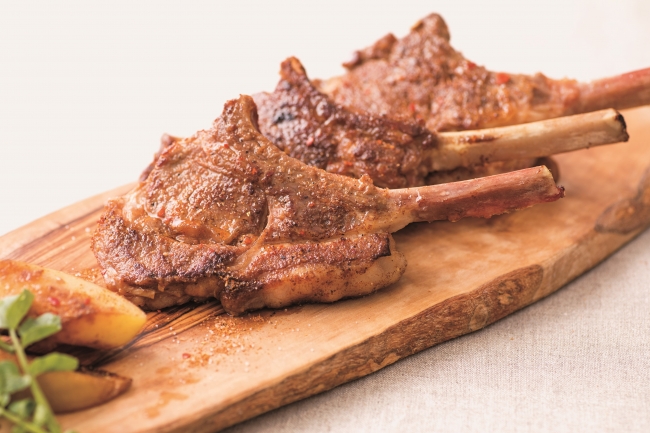 ハーブ香辛料を全体的にまぶして一気に焼き、肉汁を内に閉じ込めた羊肉のグリルです。