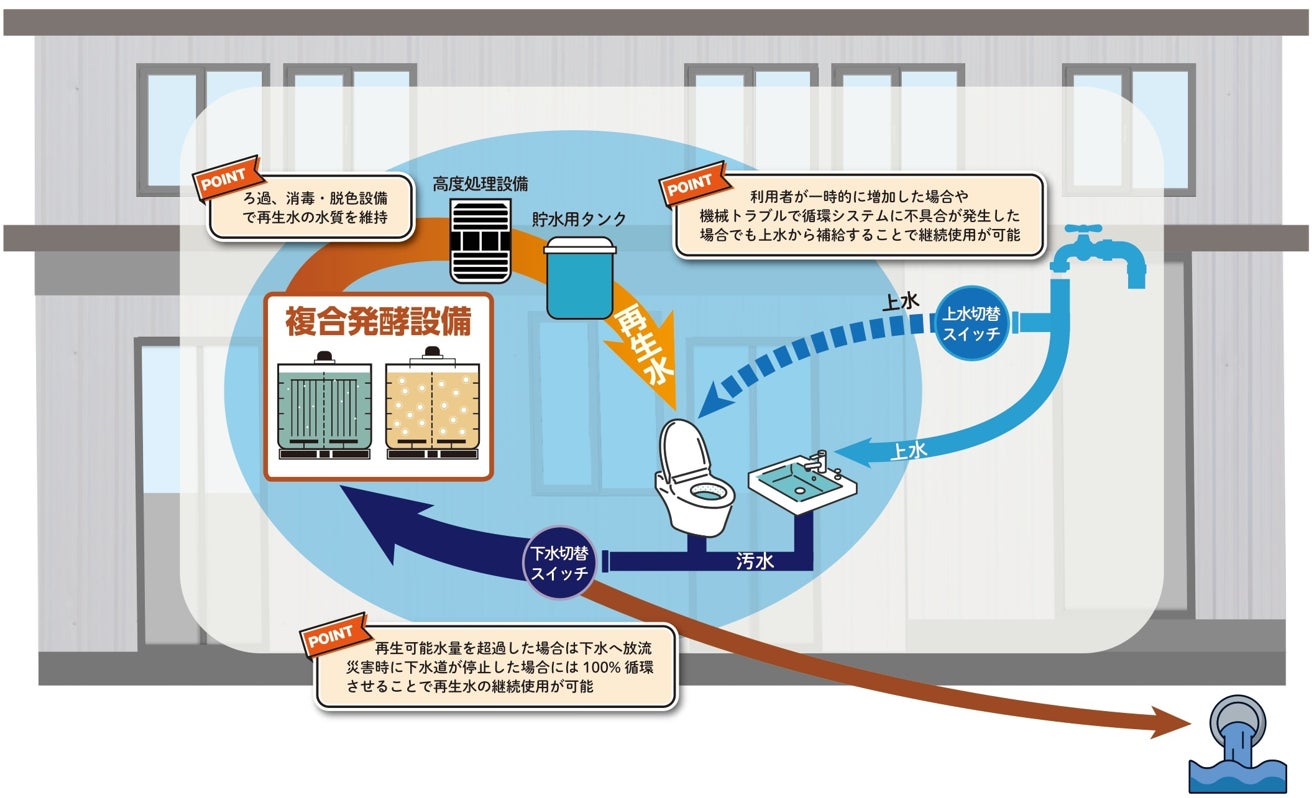 (1)「まいぱり」敷地内の施設から排出される汚水を、塩素などの化学薬品を使用せず、複合発酵設備で処理することで、再利用が可能なレベルまで浄化し、施設のトイレの洗浄用水として循環利用。
