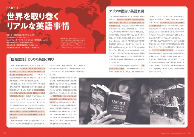 世界中の英語話者のうち、その大半を占めているのは、実はノンネイティブスピーカーだと言われています。本特集では、英語母語圏以外のさまざまな国の英語に注目します。その英語に見られる母語の影響や、発音の特徴、聞き取りポイントなどをご紹介。また、世界で活躍する著名人たちの英語スピーチをもとに、「英語との向き合い方」や「相手に伝えるためのコツ」を伝授します。