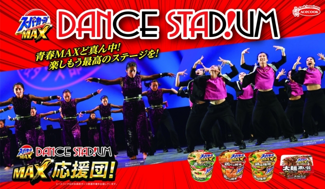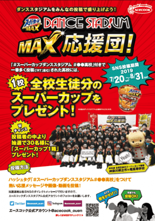 エースコック株式会社では、『ダンススタジアム』を盛り上げるスペシャルサイト『MAX応援団!』を開設します。スペシャルサイトでは出場選手や出場校を応援するメッセージをSNSアプリ(Twitter、instagram)を使って投稿することで参加できる、「ダンスタ応援MAXキャンペーン」を7月20日(土)より実施します。指定の#(ハッシュタグ)をつけて応援メッセージや写真、動画を投稿すると「全校生徒分」のスーパーカップなどが当たるキャンペーンです。