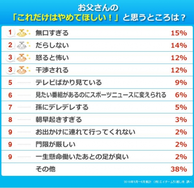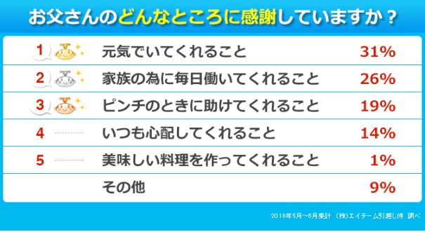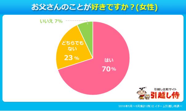 株式会社エイチームのグループ会社である株式会社エイチーム引越し侍(本社:愛知県名古屋市、代表取締役社長:熊澤博之)は、同社が運営する引越し比較サイト『引越し侍』の利用者へ実施したアンケート結果をもとに、「我が家のお父さん」に関する調査レポートを公開いたしました (https://hikkoshizamurai.jp/report/my-best-father/)。