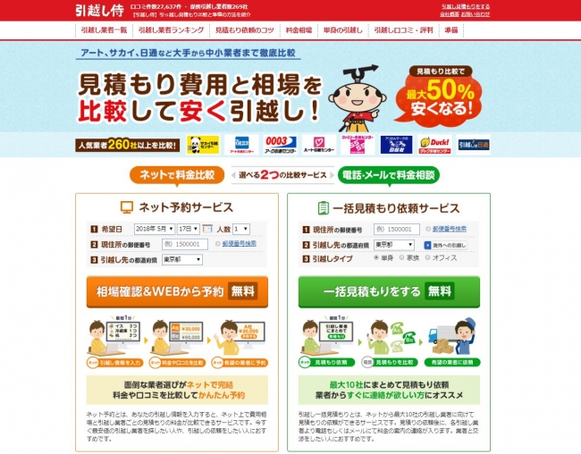引越し情報を入力するだけで、全国270社以上(2018年6月現在)の引越し会社の中から、お客様の条件にあわせて、料金やサービス、クチコミを簡単に比較し、引越し会社を予約したり、一括で最大10社に見積もりの依頼ができるWebサイトです。引越し会社に見積もり依頼・予約ができるのはもちろん、海外への引越しやオフィスの引越し、ピアノの引越し、ピアノの売却などをサポートするサービスもございます。今後も、引越しをお得&お手軽に実施するためのサービス拡充を目指してまいります。