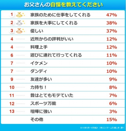 最も多かったのが、「家族のために仕事をしてくれる」という回答。子供たちのために、一生懸命頑張ってくれるお父さんの姿を誇りに思っているようです。
