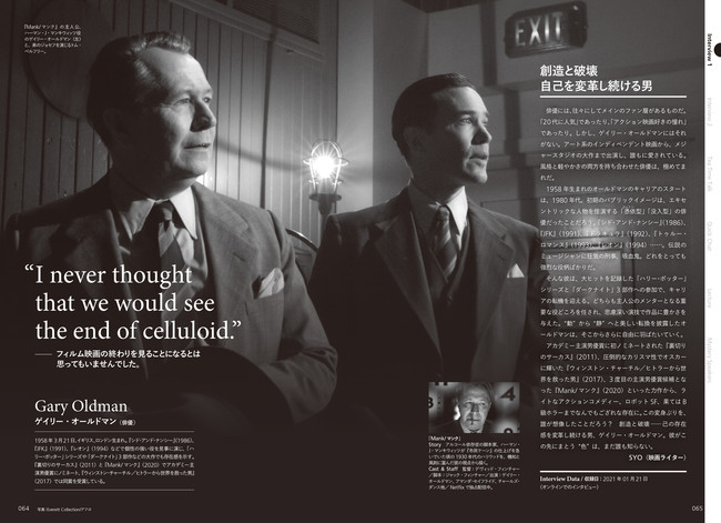 Netflixオリジナル映画『Mank/マンク』に主演したゲイリー・オールドマンのインタビューをお届けします。本作は映画史に残る名作『市民ケーン』(1941)の脚本が生まれるまでを、当時の映画業界の裏話を織り交ぜながら描いた作品です。新しい製作方法・鑑賞方法のおかげで映画化が実現した一方、作品自体は1930年代を再現した懐古的なモノクロ映像で構成されています。映画のデジタル化やコロナ禍で変わっていく撮影方法・鑑賞方法に対して、オールドマンがどんな気持ちを抱いているかをお聞きください。