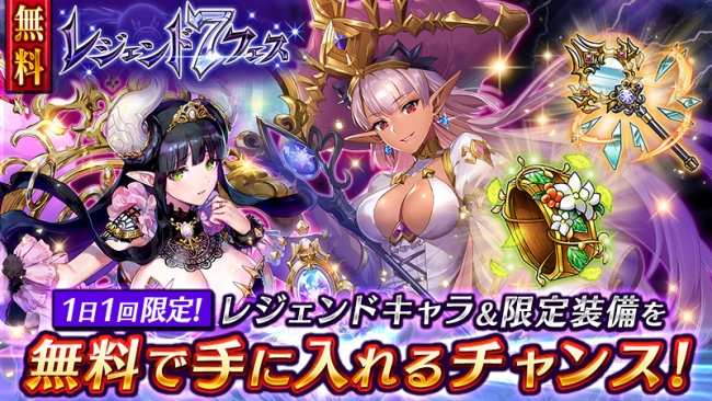 レジェンドキャラや限定装備が排出される「レジェンド7フェス」が、2,000万ダウンロード突破を記念して無料で登場します。1日1回限定で、無料で10連ガチャを引くことができます。