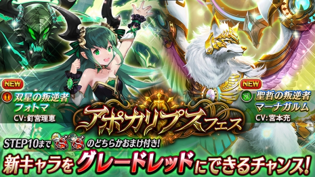 新キャラ「双星の叛逆者フォトマ」「聖哲の叛逆者マーナガルム」が登場する「アポカリプスフェス」を開催します。2体は格段に強力な新リミットバースト「アポカリプスバースト」を所有する限定キャラです。初回は半額の1,500ダイヤで引くことができます。
