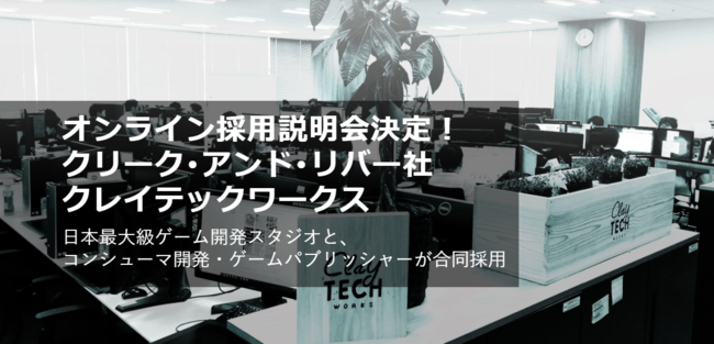 全18職種、ゲームクリエイター大募集!日本最大級のゲーム開発スタジオとゲームパブリッシャー 11/12(木)クリーク・アンド・リバー社&クレイテックワークス オンライン中途採用説明会 開催