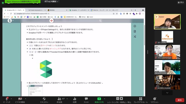 最後に、運営メンバーへの参加を呼び掛けた先生方、インタビューのお願いをした先生や卒業生たち、講師をお願いしたみなさん、全員が二つ返事で引き受けてくださいました。Scrapboxの利用に関してはNota株式会社のみなさんにお世話になりました。これらの方々のご助力なくして、本研修は実現しませんでした。オンラインでの研修は、研修内容からゴールの設定まで旅行型研修の企画以上に難しい面がありますが、オンラインでも十分に意義のある研修の実施が可能であることを改めて実感しました。