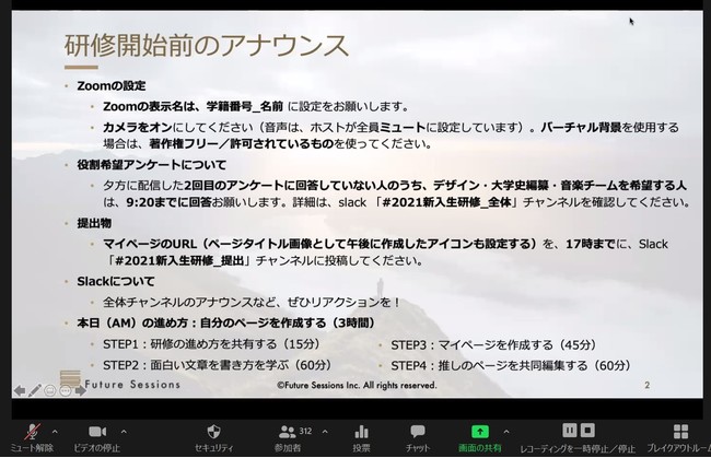 2021年度、本来は新入生全員で群馬での新入生研修を行う予定だったが、感染症の拡大が収まらず今年も完全オンライン研修に切り替えることにした。昨年の経験を生かして、さらに進化した研修が企画された。研修では、今年も授業はZoom、コミュニケーションはSlack、提出物はGoogle Classroomへ、完成したページをシェアする場所として新たにScrapboxを使用した。