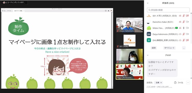午後は自分のアイコン制作講座を実施、マイページのブラッシュアップを行いました。また、3日目からのグループワークに向け、グループ別に立ち上がったZoomに入り直し、メンバーの顔合わせや今後の進め方についての打ち合わせを行いました。