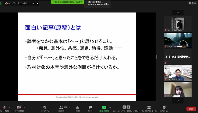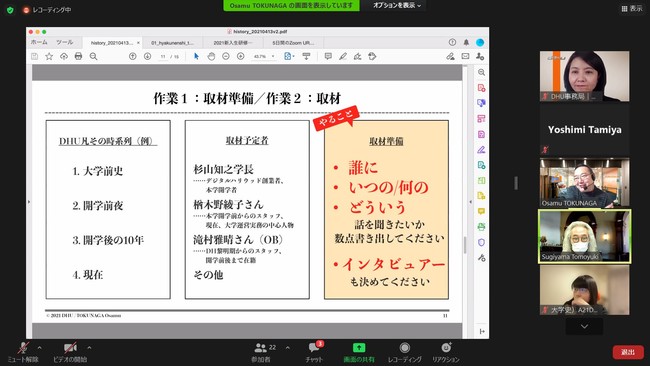 【ライターグループ、大学史編纂グループ、デザイングループ】は、週刊朝日元編集長である山口一臣氏による『インタビュー術講座』を受講後、グループ別のZoomに分かれ活動しました。