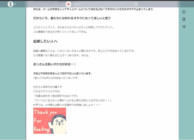 午後は研修テーマの発表、Nota株式会社の北村さんによるScrapboxの使い方講座、鷹野凌氏による著作権説明、Scrapboxページ作成ルールの説明、企画力・見出し力講座の実施。「自分自身の昨日の出来事」を新書タイトル風に見出しを付け、Slackの提出チャンネルに投稿しました。