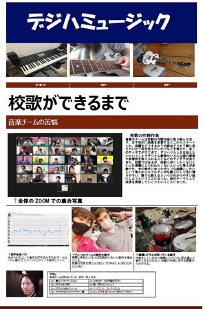 【音楽グループ】は、Zoom上での共同作業に留まらず、一部の学生が本学駿河台キャンパスにあるMAルーム(音響収録室)に集まり音楽制作を行うなどし、30人の学生が作詞作曲した非公式校歌を完成させました。