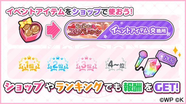 また、イベント期間中、「ライブ」後に入手できるアイテムの中にイベントアイテム「手作りチョコレート」が追加されます。「手作りチョコレート」は専用のイベントショップにて様々なアイテムと交換することができます。
