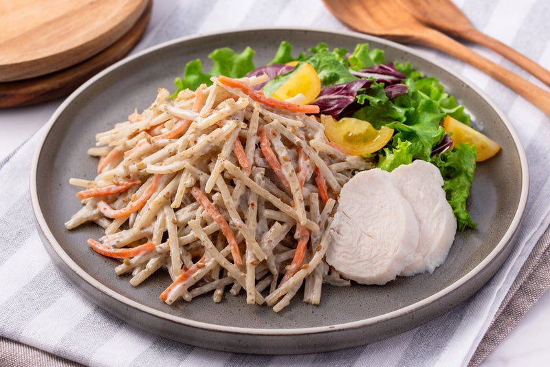 千切りのごぼうににんじんを加えました。ごまの香りがやわらかく香るあっさりとした味わいに仕上げています。適度な粘性があるためダレにくく、盛り付け後もきれいな状態をキープします。美味しさはそのままに製造日+90日の賞味期間です。